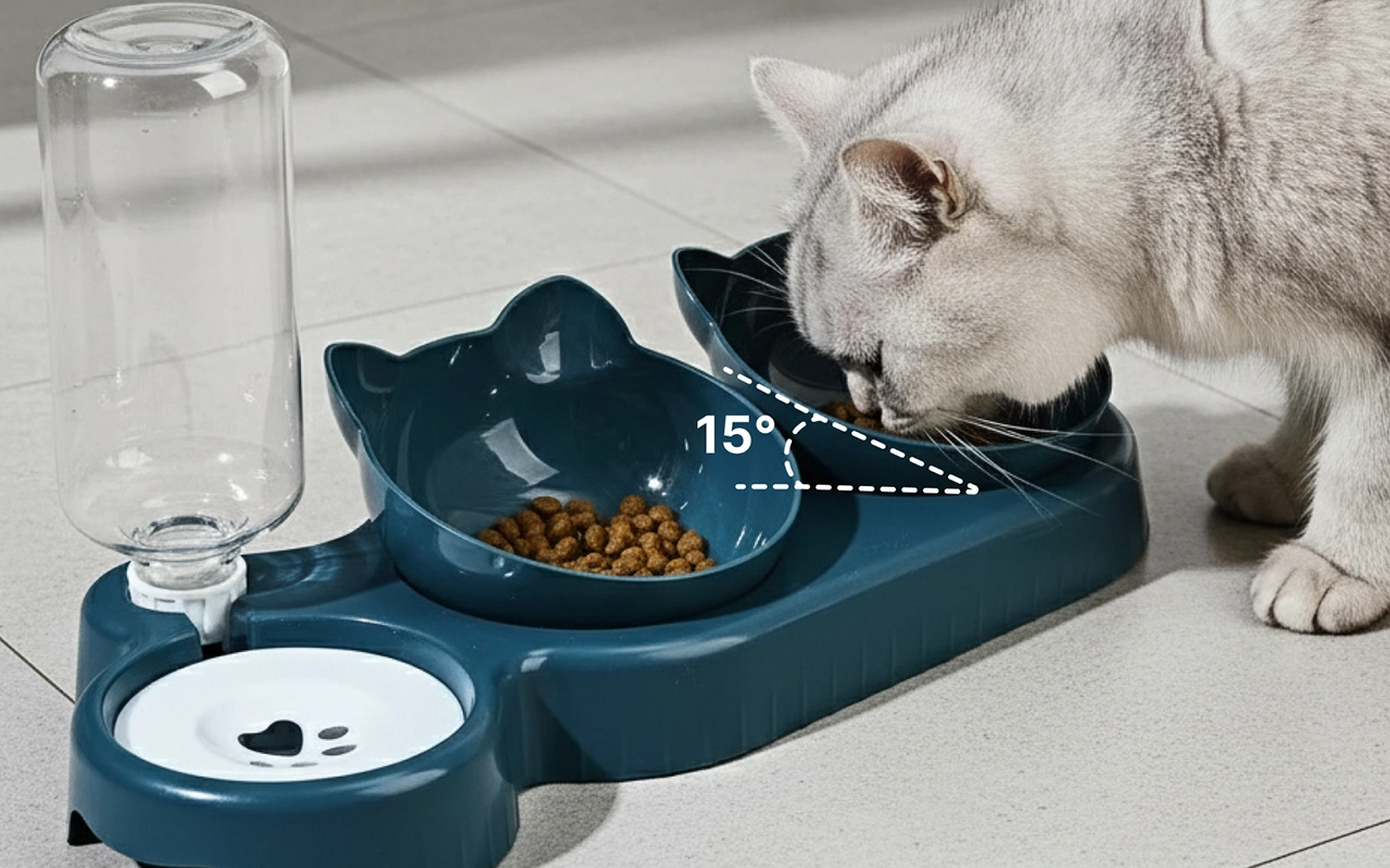 The tilted bowls actually help my older cat a lot. No more sneezing water everywhere. Easy to wipe down and refill, even for my kids.