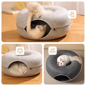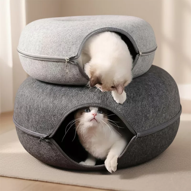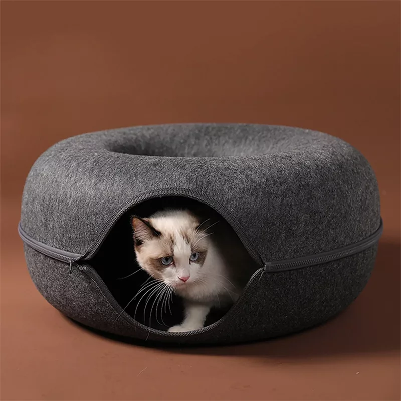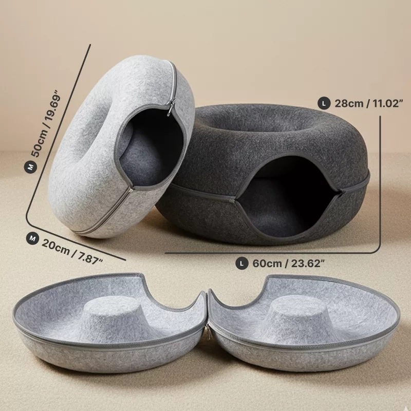 Our two cats share the donut! One hides inside while the other lounges on the top. The felt doesn’t trap their shed hair either.