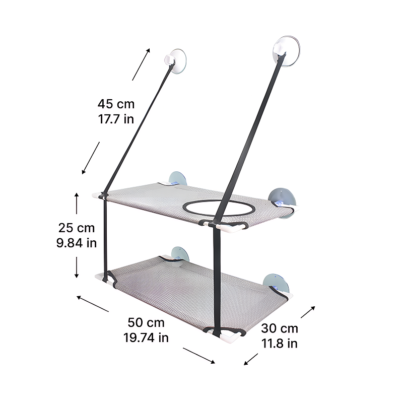 Let every feline enjoy fresh air and lovely views daily. Primdog Double Deck Cat Hammock keeps pets safe and very happy indoors. Strong suction cups hold it firmly on any window surface with ease. Lightweight parts enable quick assembly without the need for any tools.