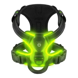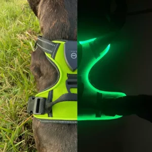 The mesh doesn’t make my dog sweat and the glowing lights are fantastic! Great for camping trips and evening strolls downtown.