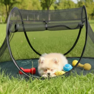 This mesh tent keeps my dog safe from mosquitoes and lets him nap outside while I garden. He seems really cozy and calm in here.