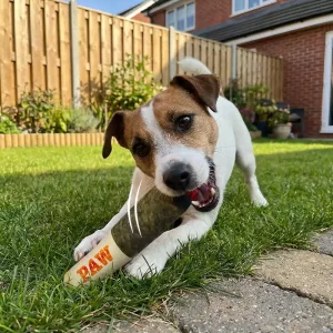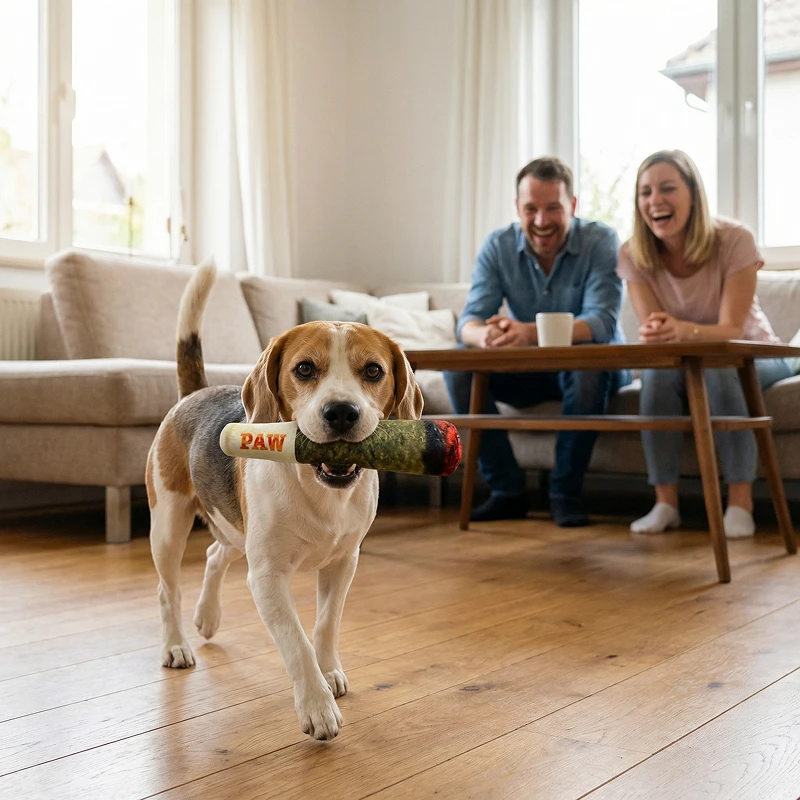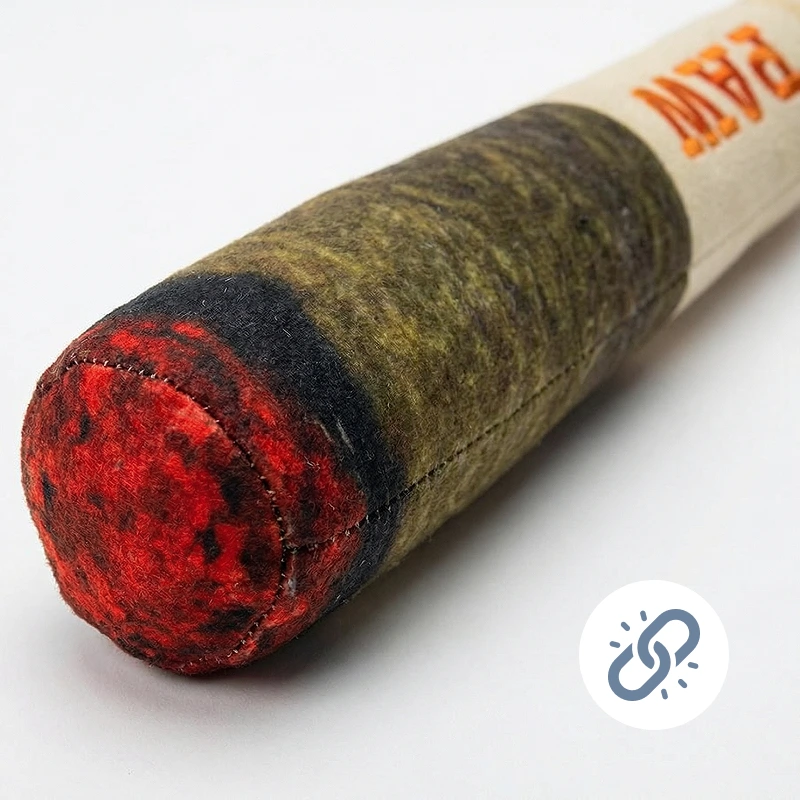 Bought the cigarette plush for my dog – he chews quite hard, but it holds up well. He loves when it squeaks!